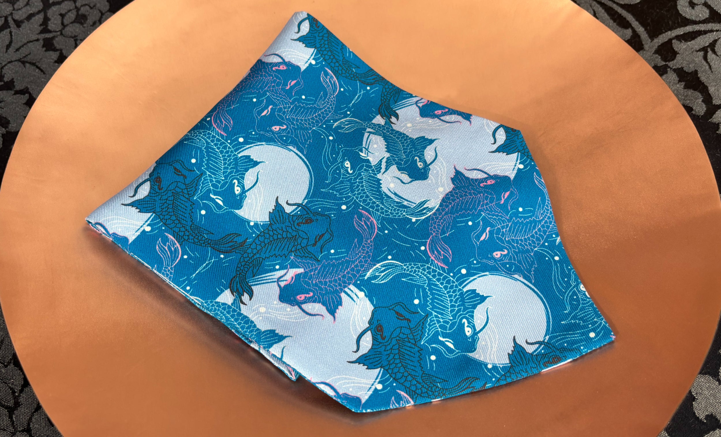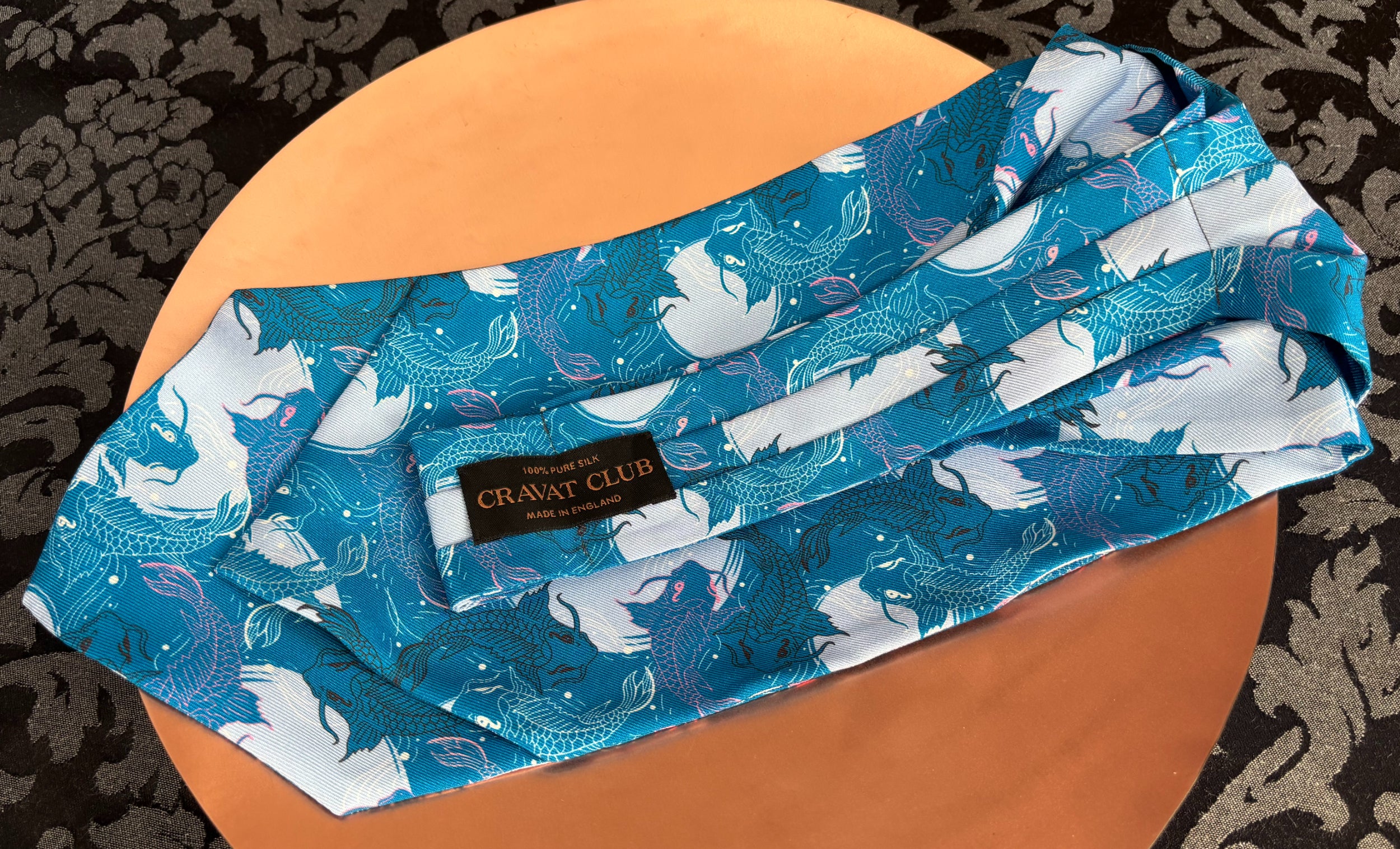 Japanese Denim Blue with Plum Blossom, Orchid Pink, White, Cloud & Thunder Grey Japanese Circling Koi Fish Pattern Printed Silk Cravat