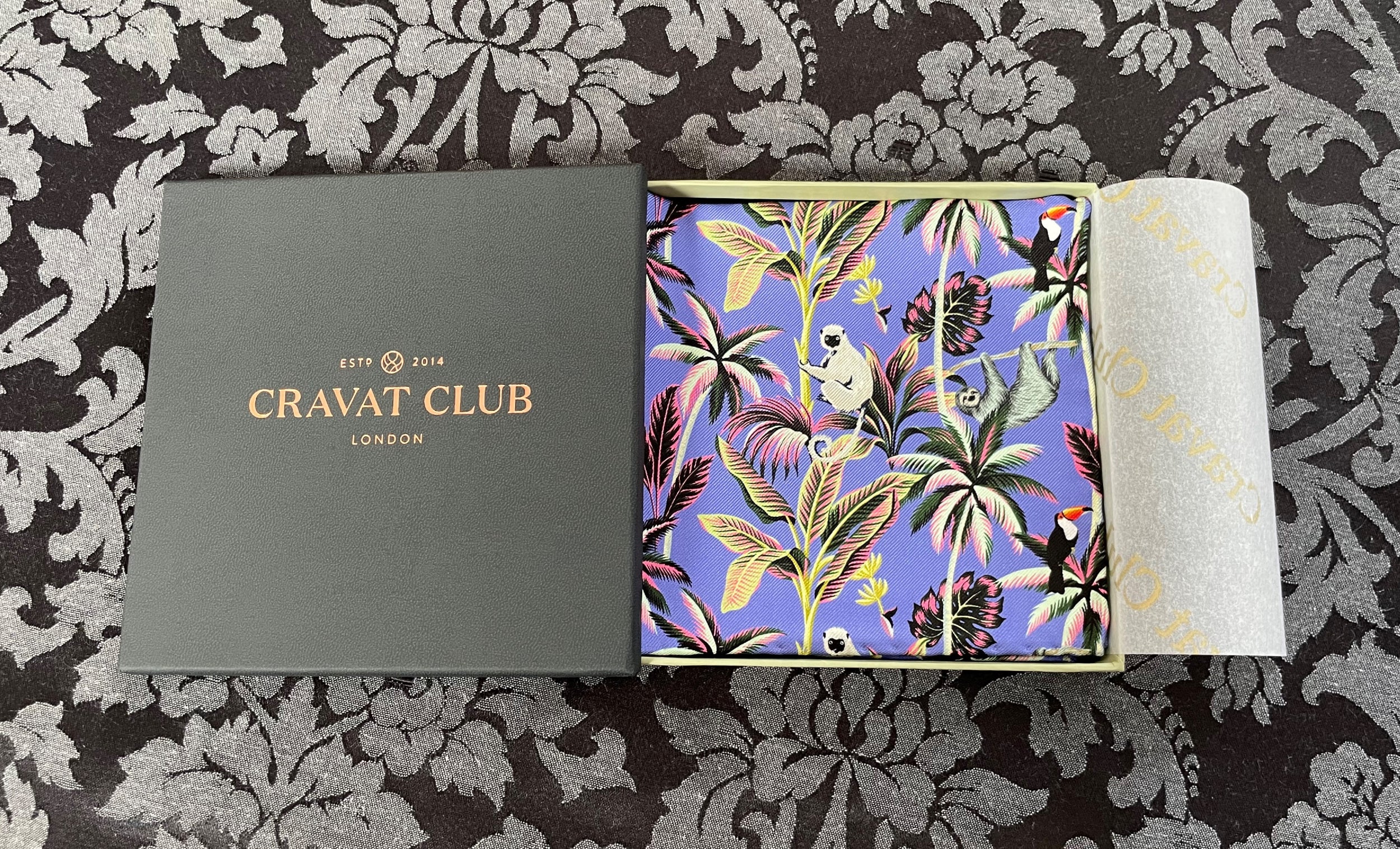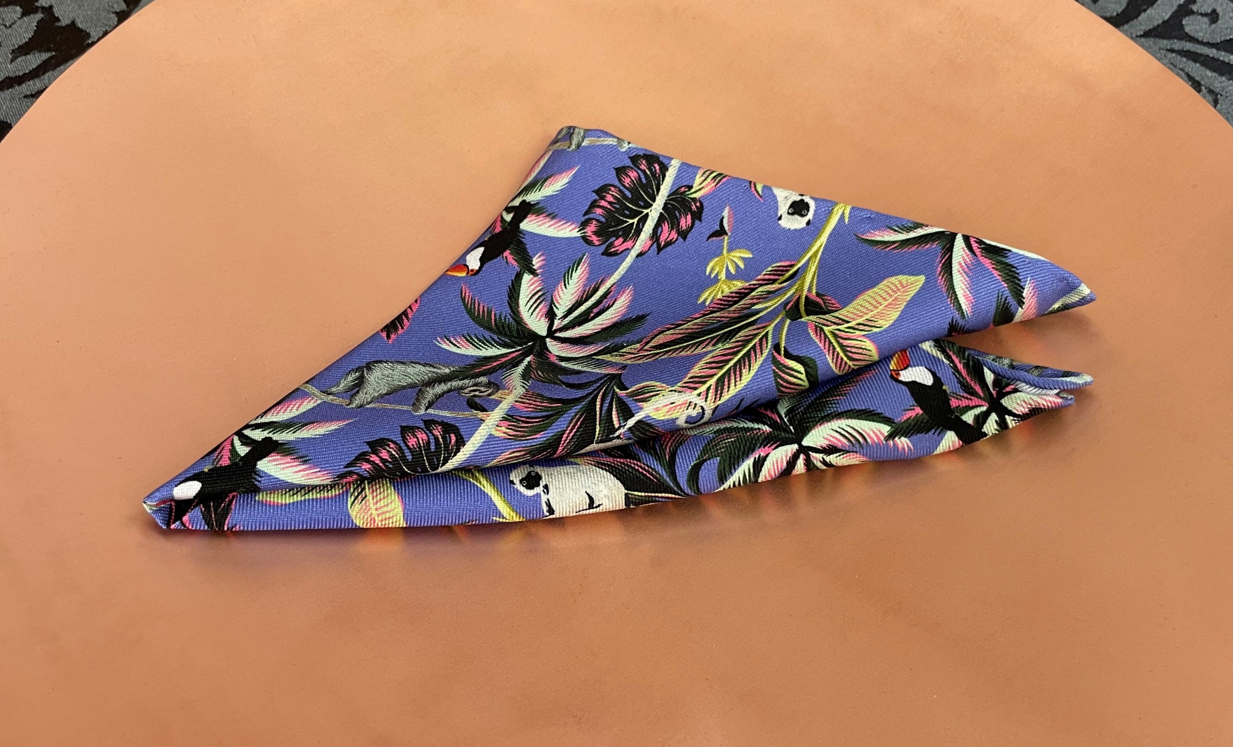 Dusk Blue with Olive, Orchid Pink, Cloud Grey & Mint Green Lemur & Sloth Jungle Scene Printed Silk Pocket Square