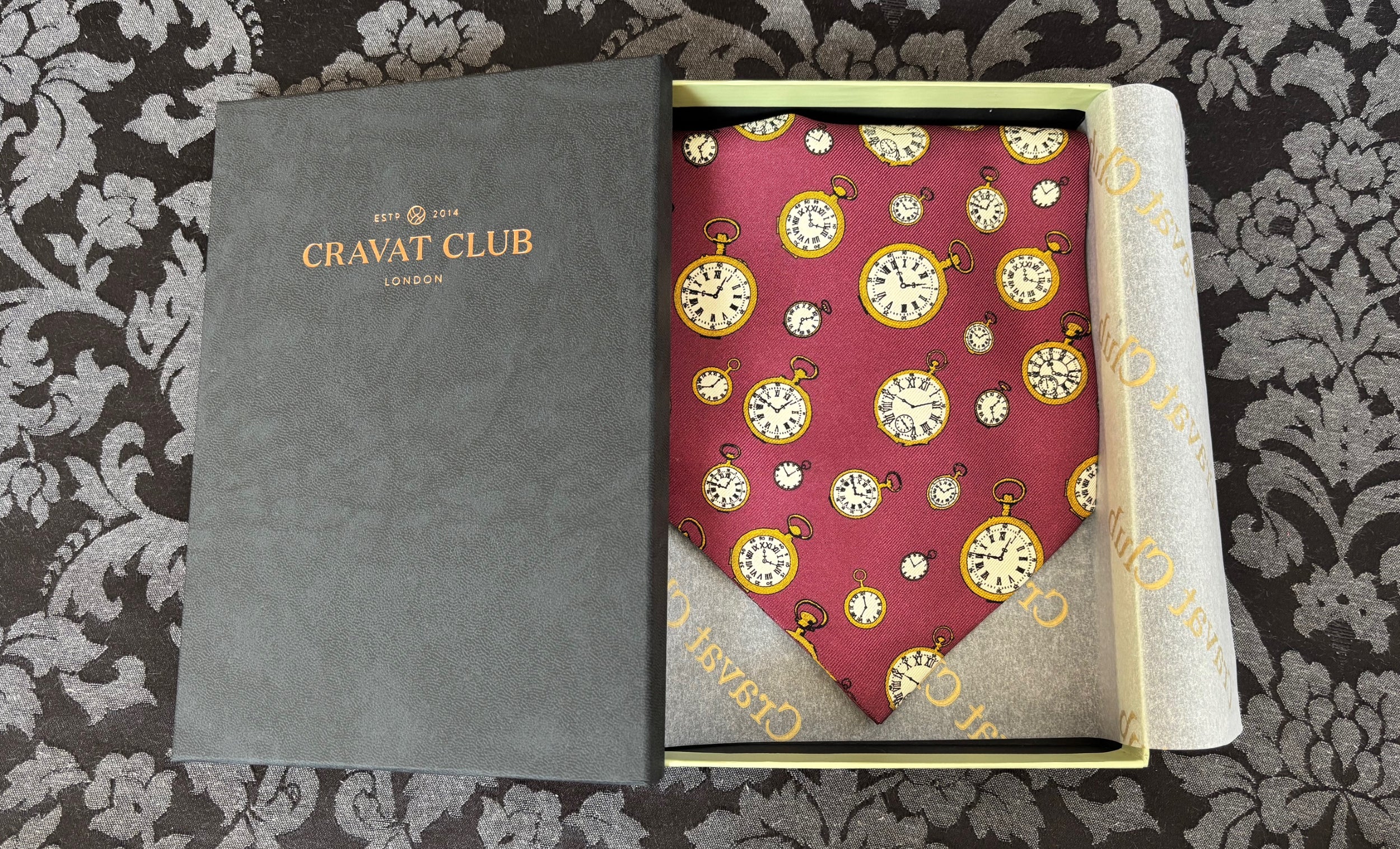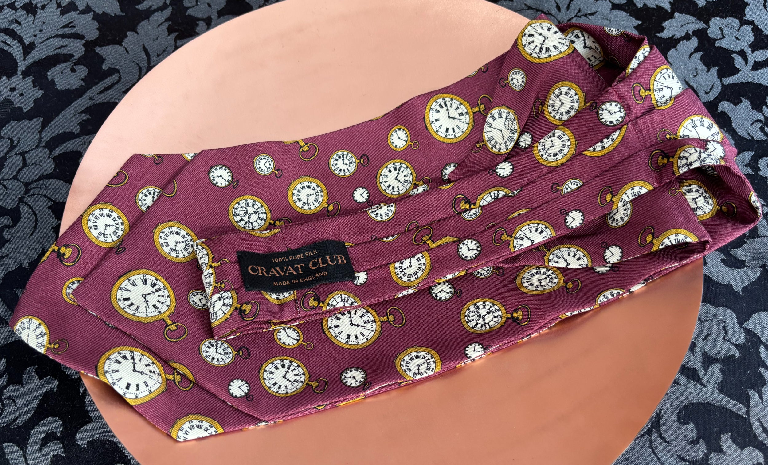 Deep Burgundy with Antique Gold, Black & Off-White Pocket Watches Pattern Printed Silk Cravat