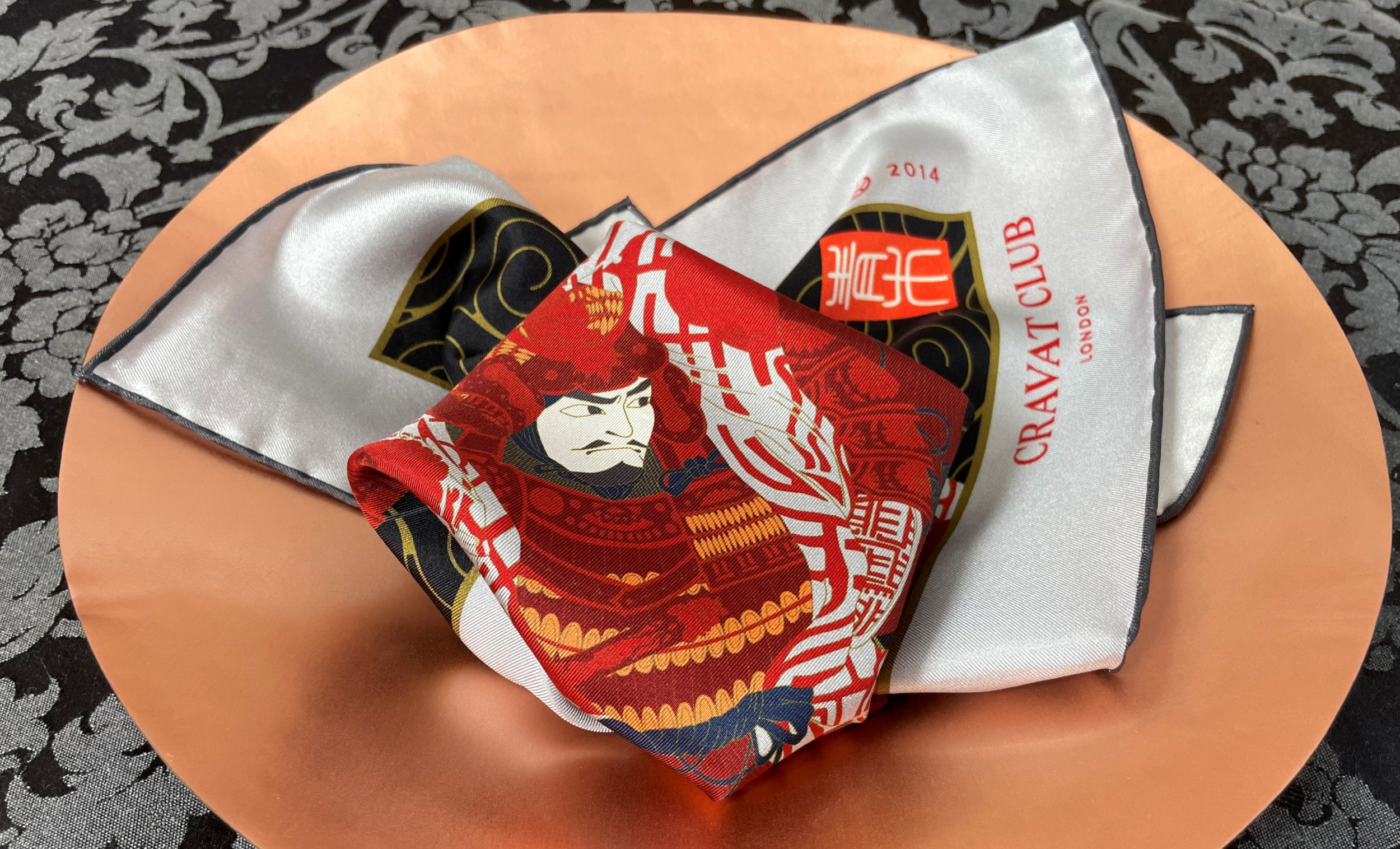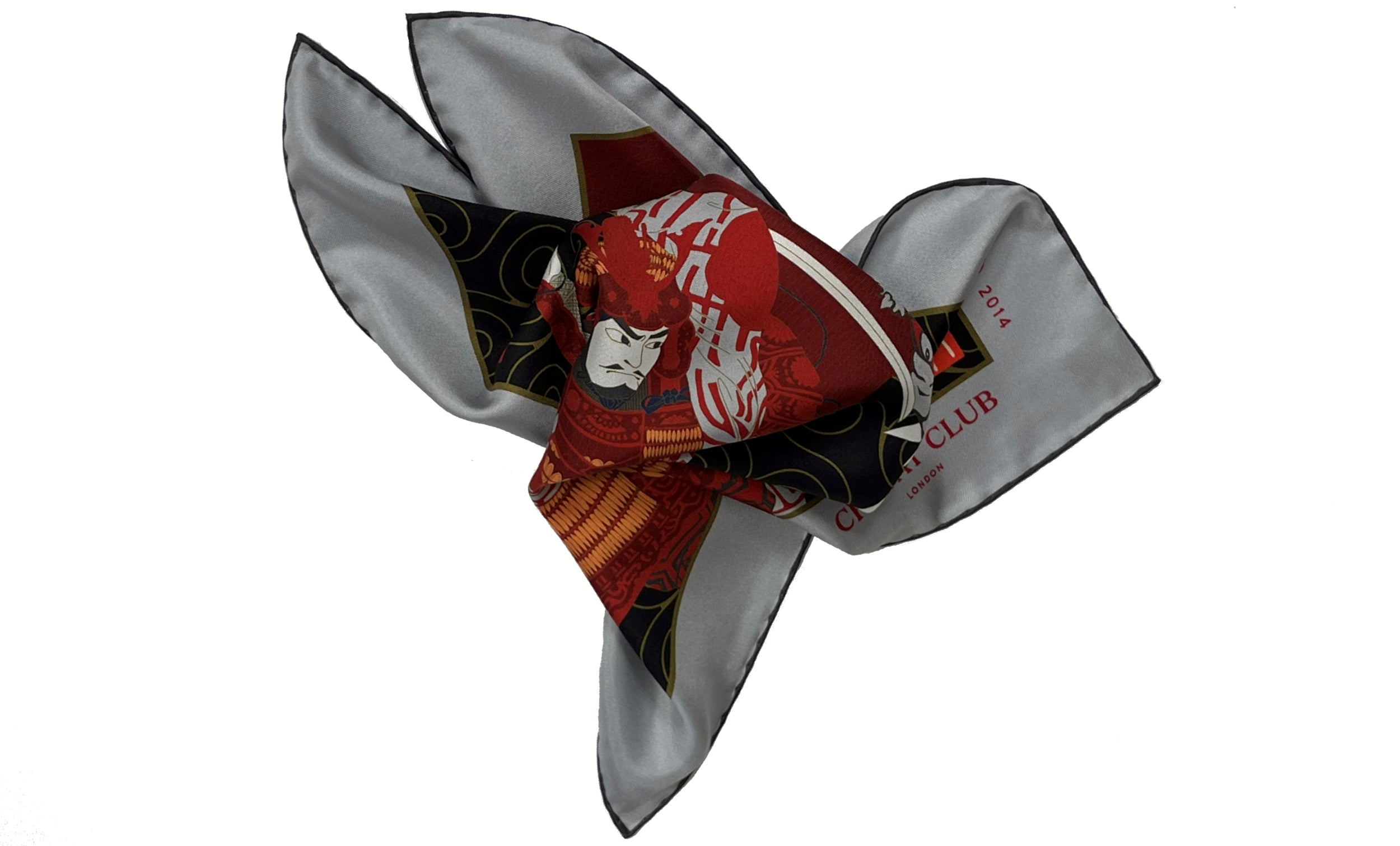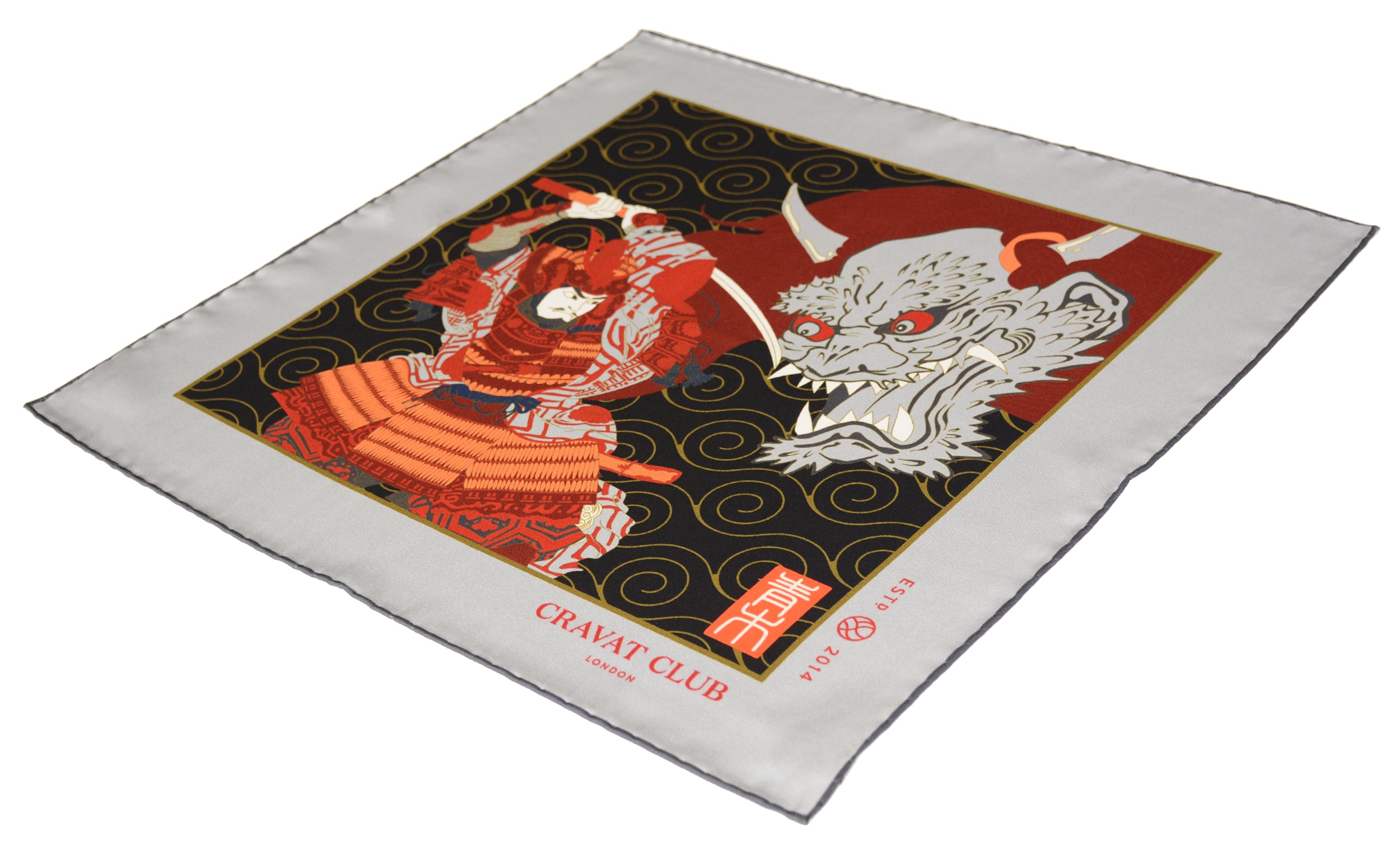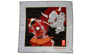 Katana Steel with Thunder Grey, Black, Carmine Red, Orange Sherbet, Crimson and Gold Samurai Battling a Demon Scene Japanese Ukiyo-e Print Silk Pocket Square