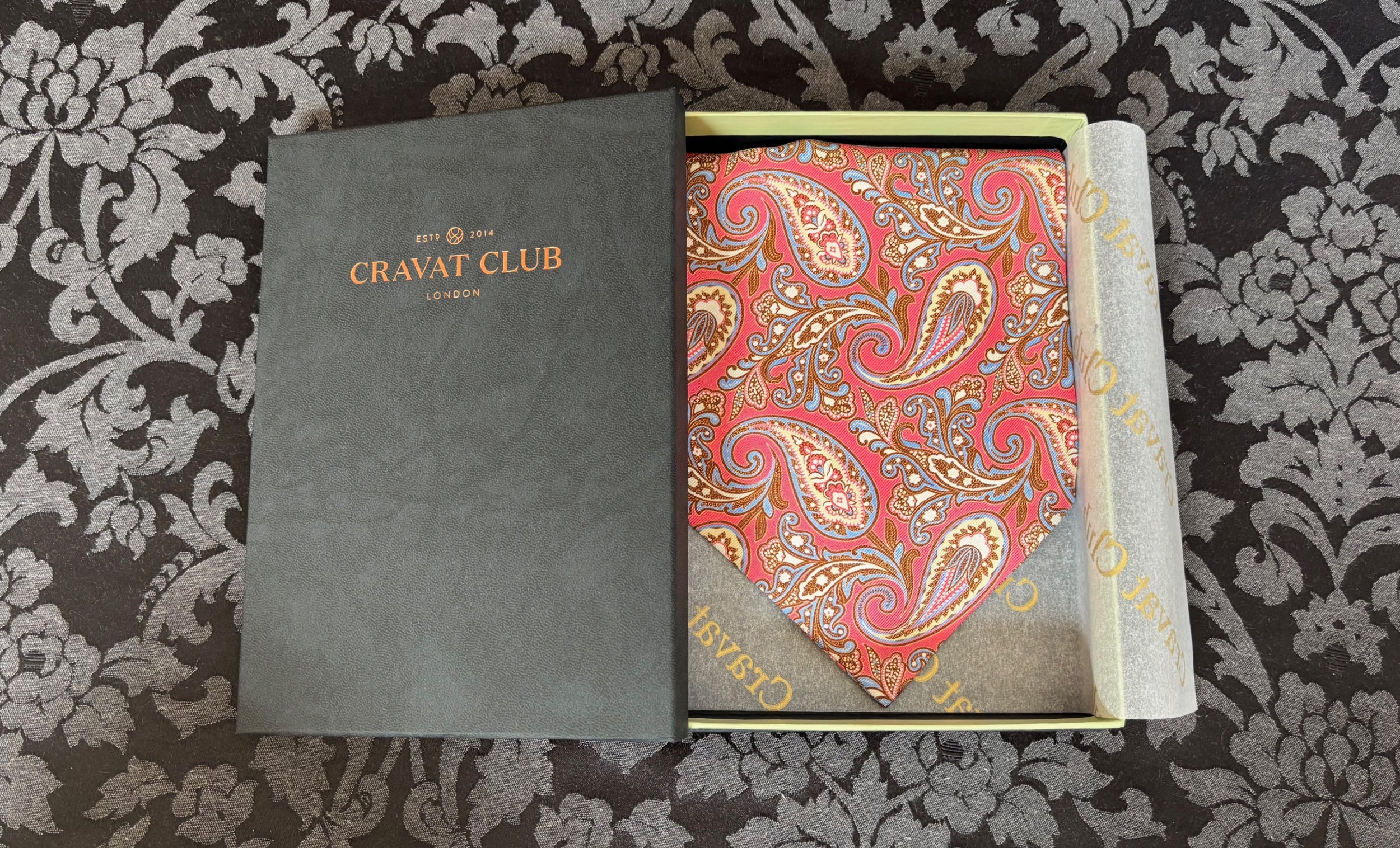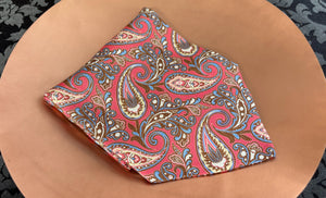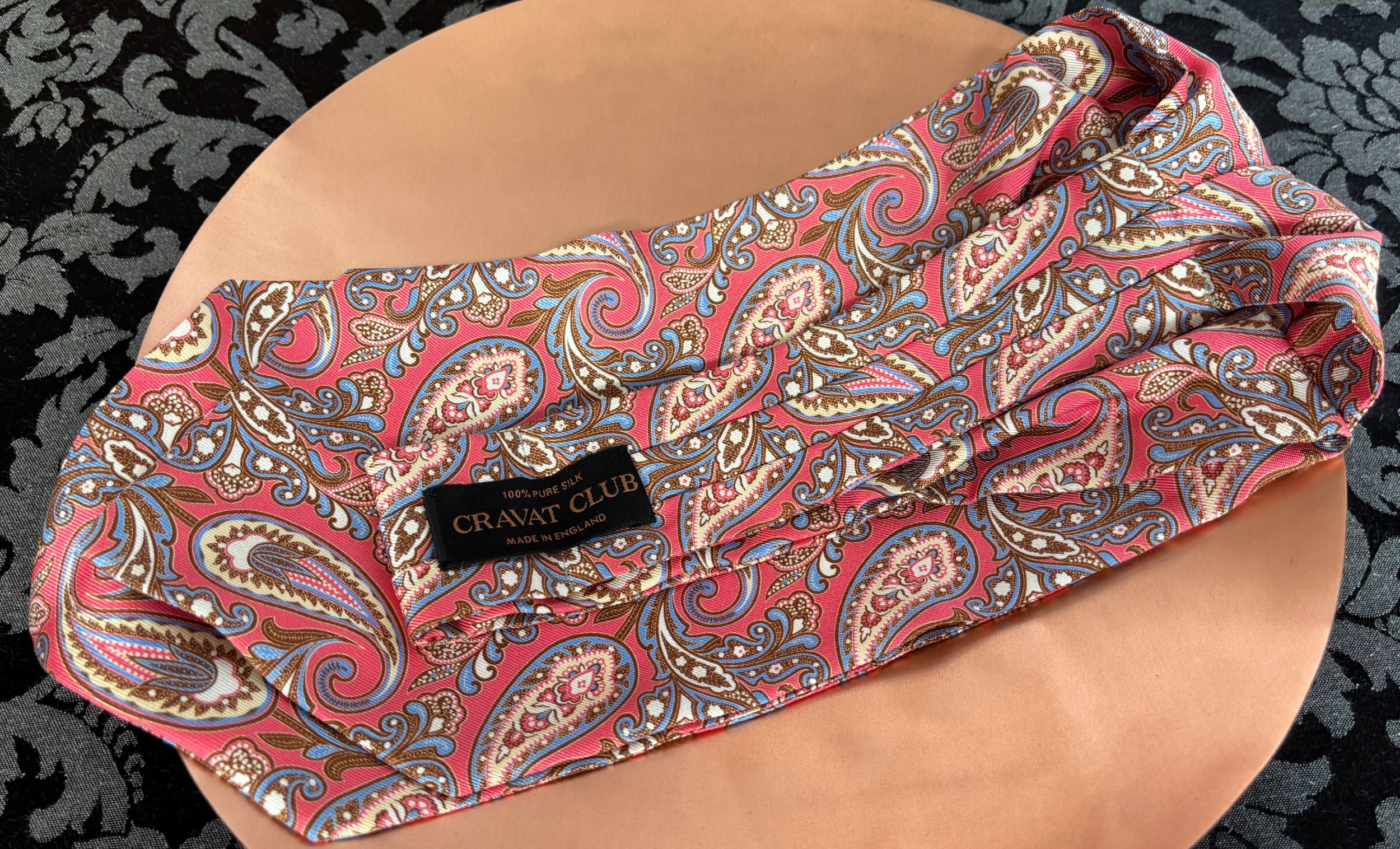 Warm Indian Pink with Cool Denim, Chocolate, Cream & White Paisley Pattern Printed Silk Cravat