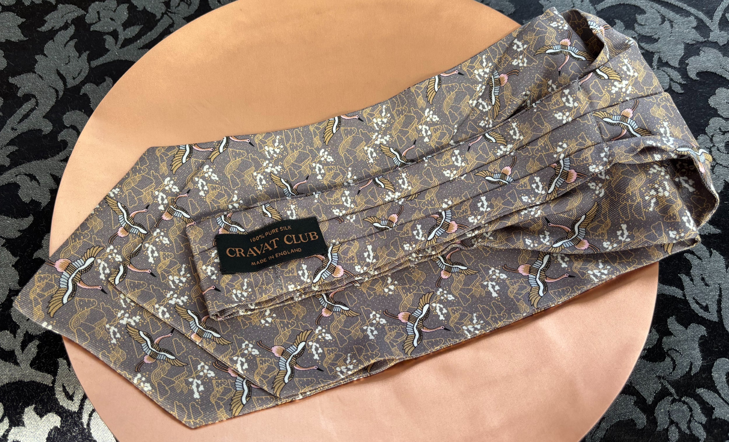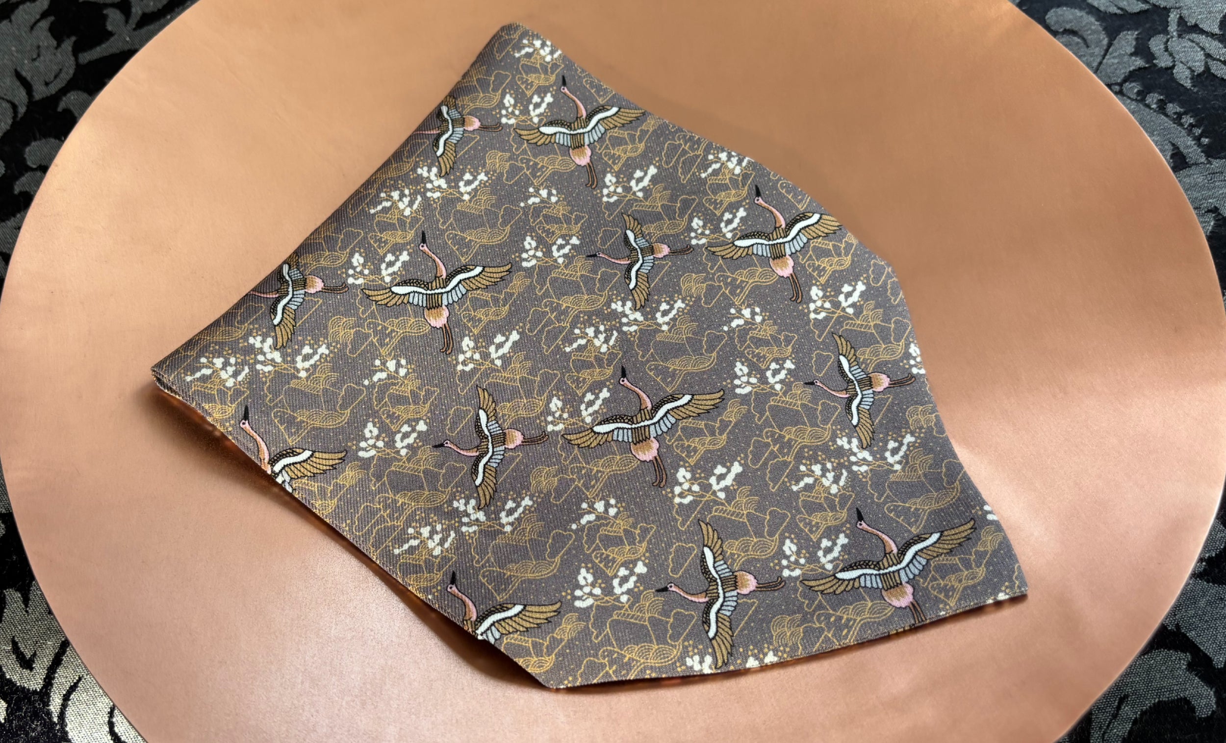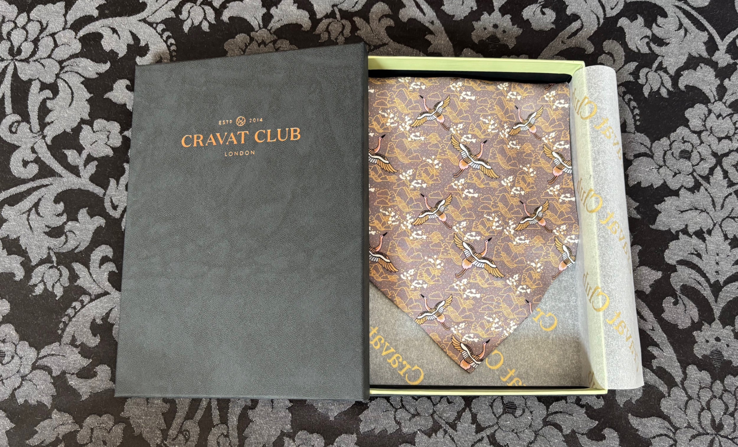 Graphite Grey with Miso Brown, Hinoki, Cherry Blossom, Black & White Japanese Cranes & Mountains Pattern Printed Silk Cravat