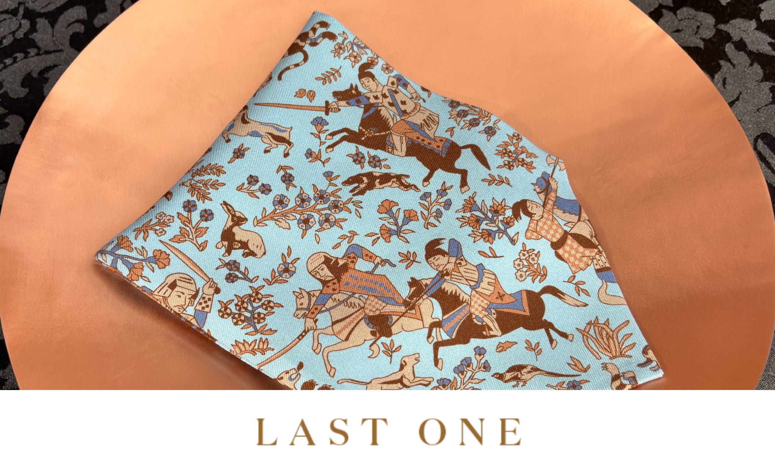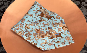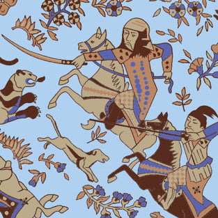 Powder Blue with Oak Brown, Caramel, Dark Denim & Taupe Ancient Mongolian Hunting Scene Printed Silk Cravat