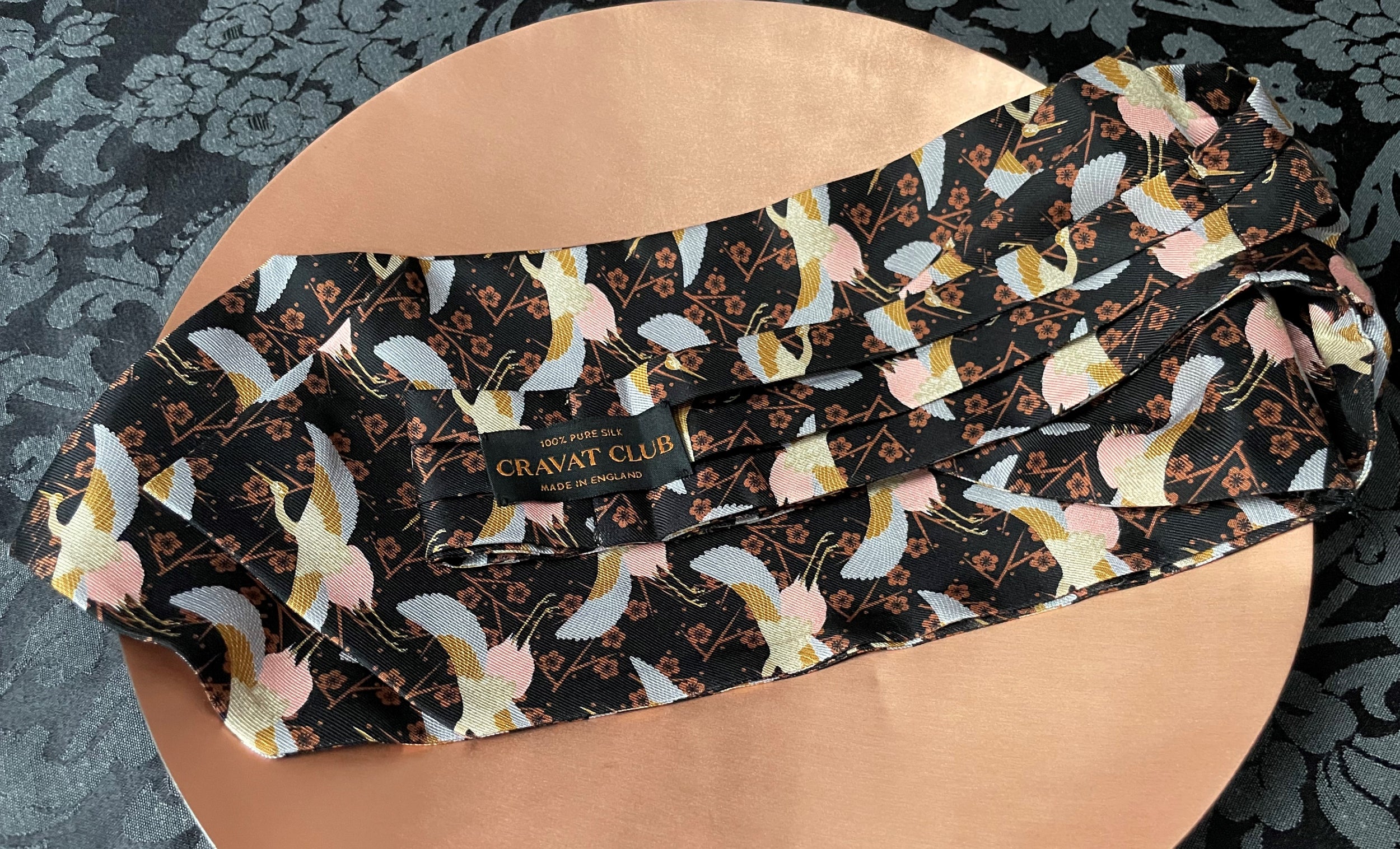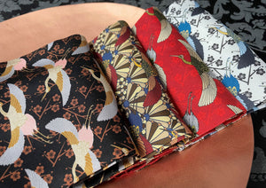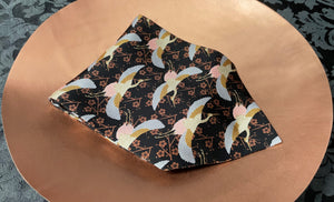 Black with Coffee Brown, Strawberry Milk, Cloud Grey, White & Olive Green Japanese Cranes in Flight Ukiyo-e Design Printed Silk Cravat