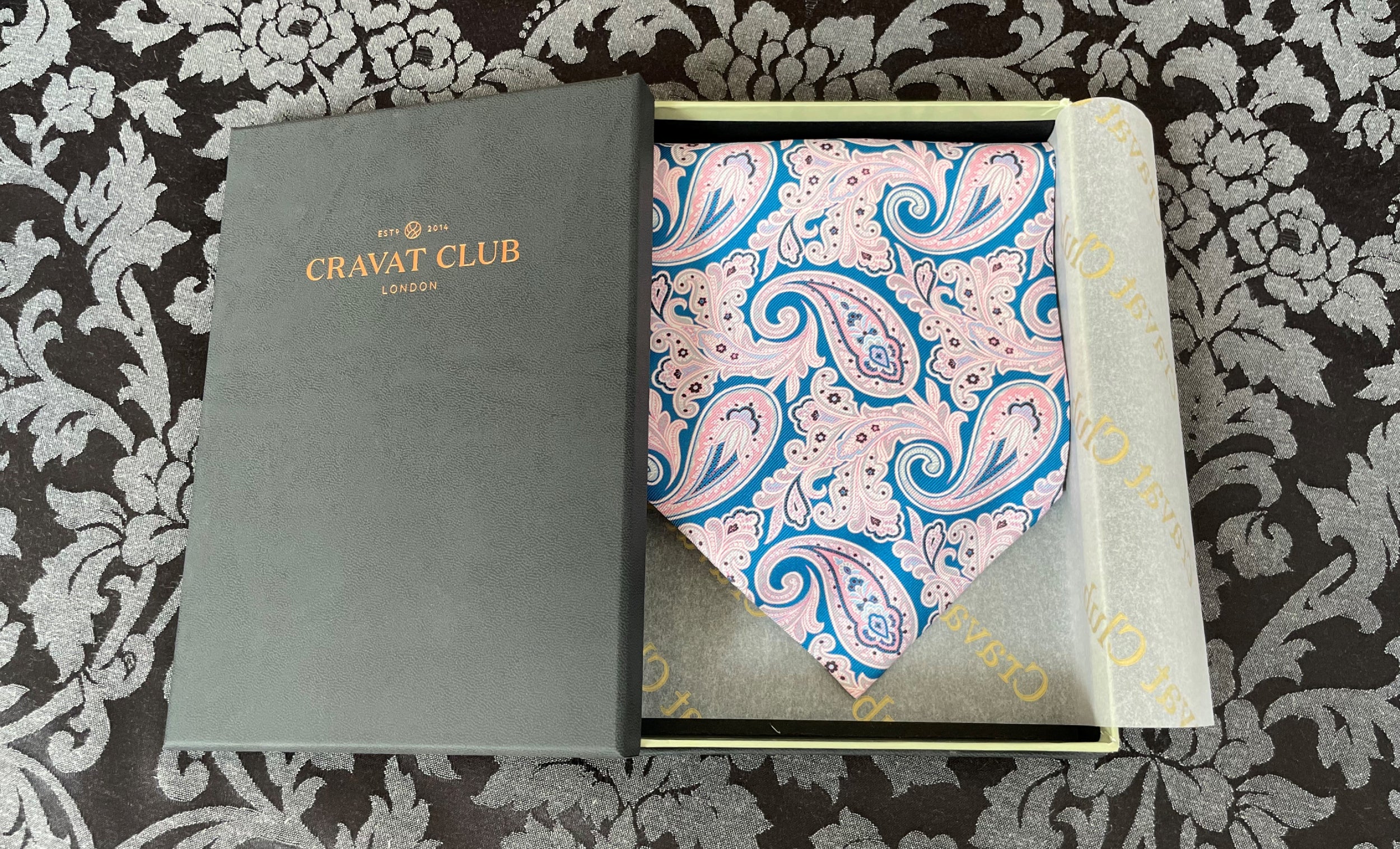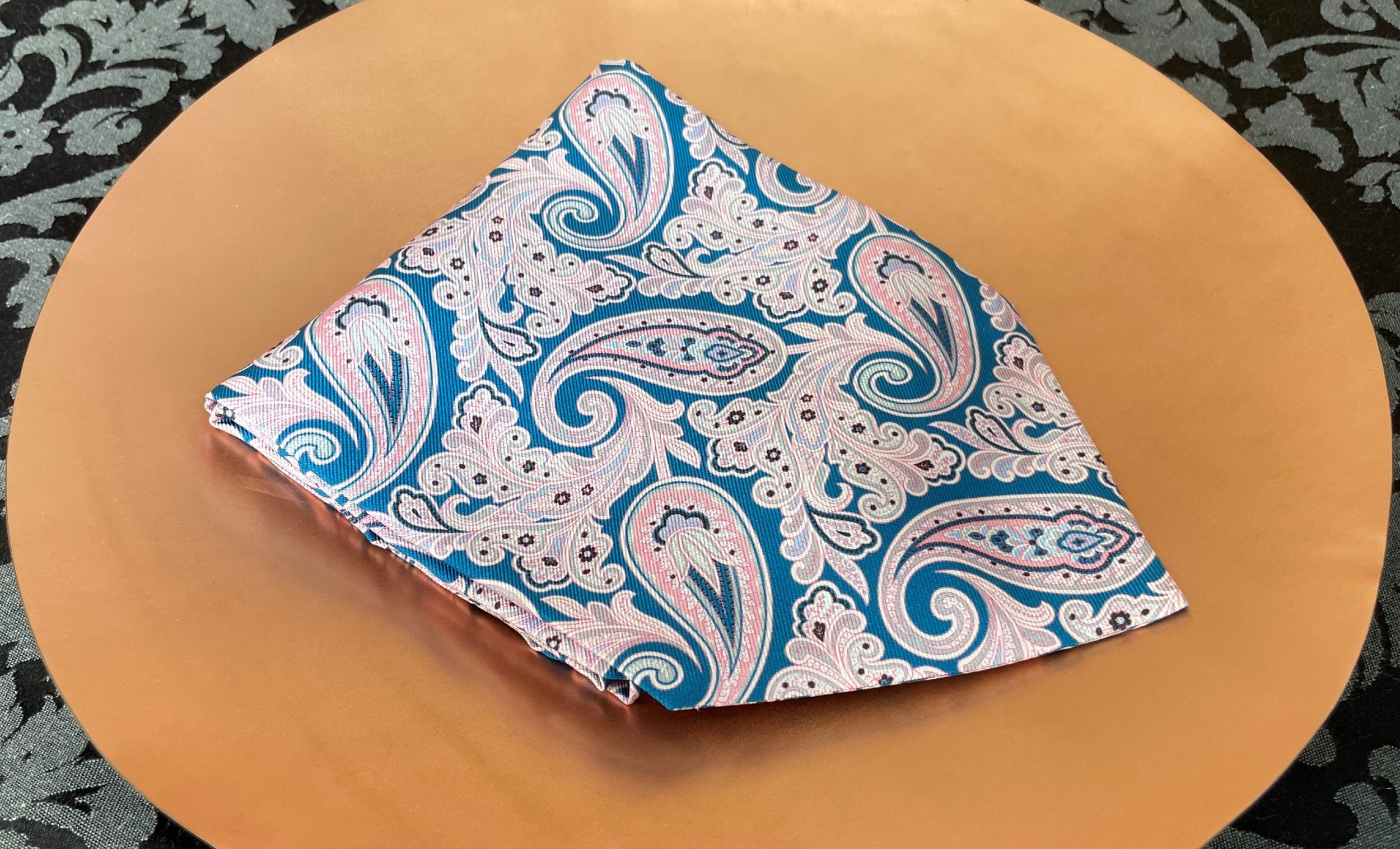 Paradise Blue with Orchid Pink, Cloud Grey & White Paisley Pattern Printed Silk Cravat