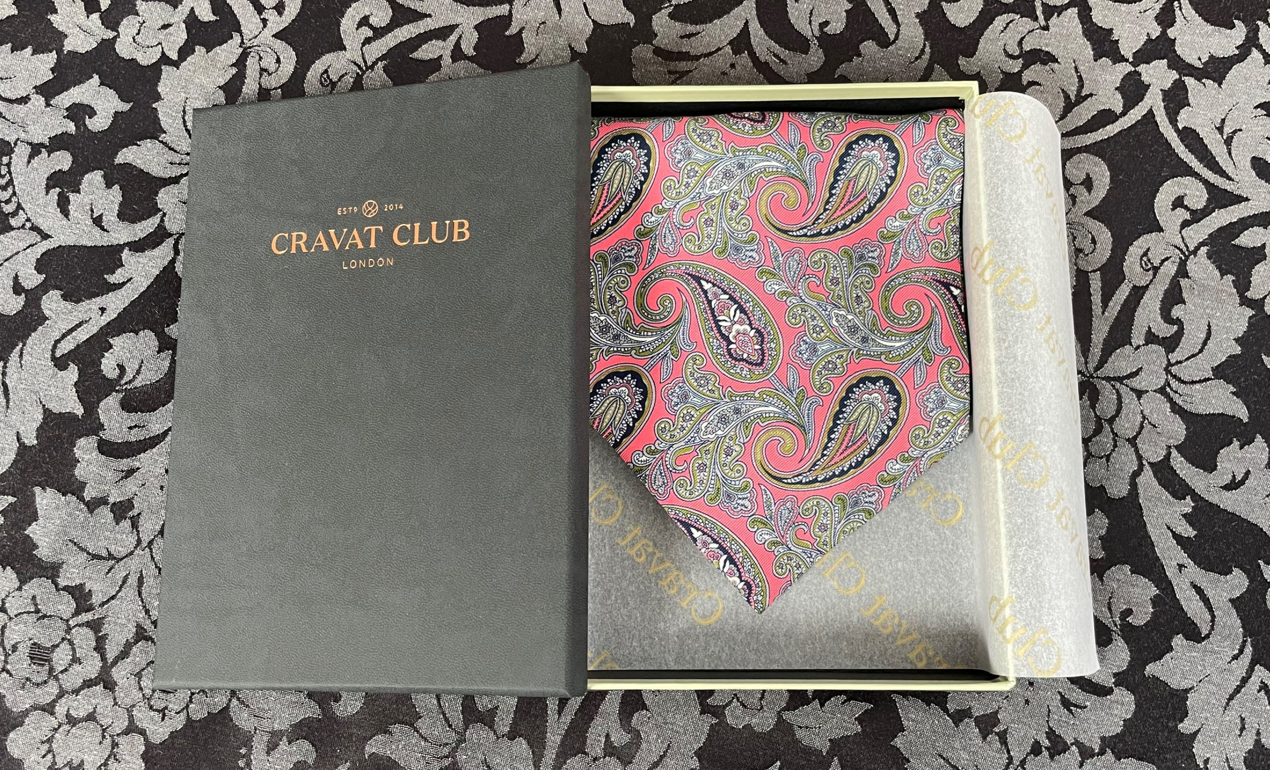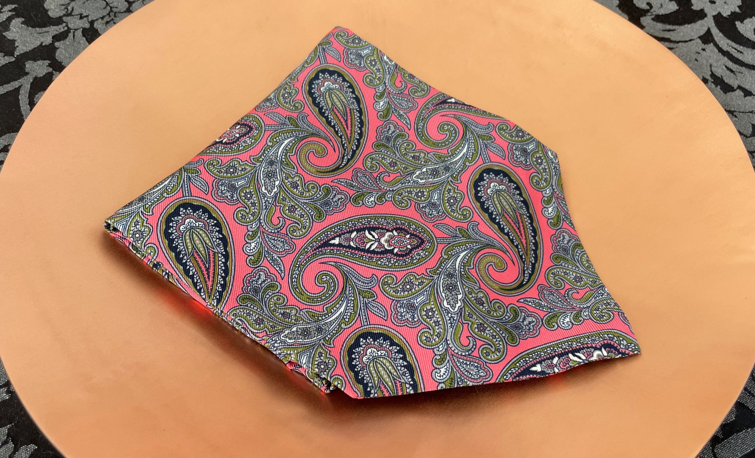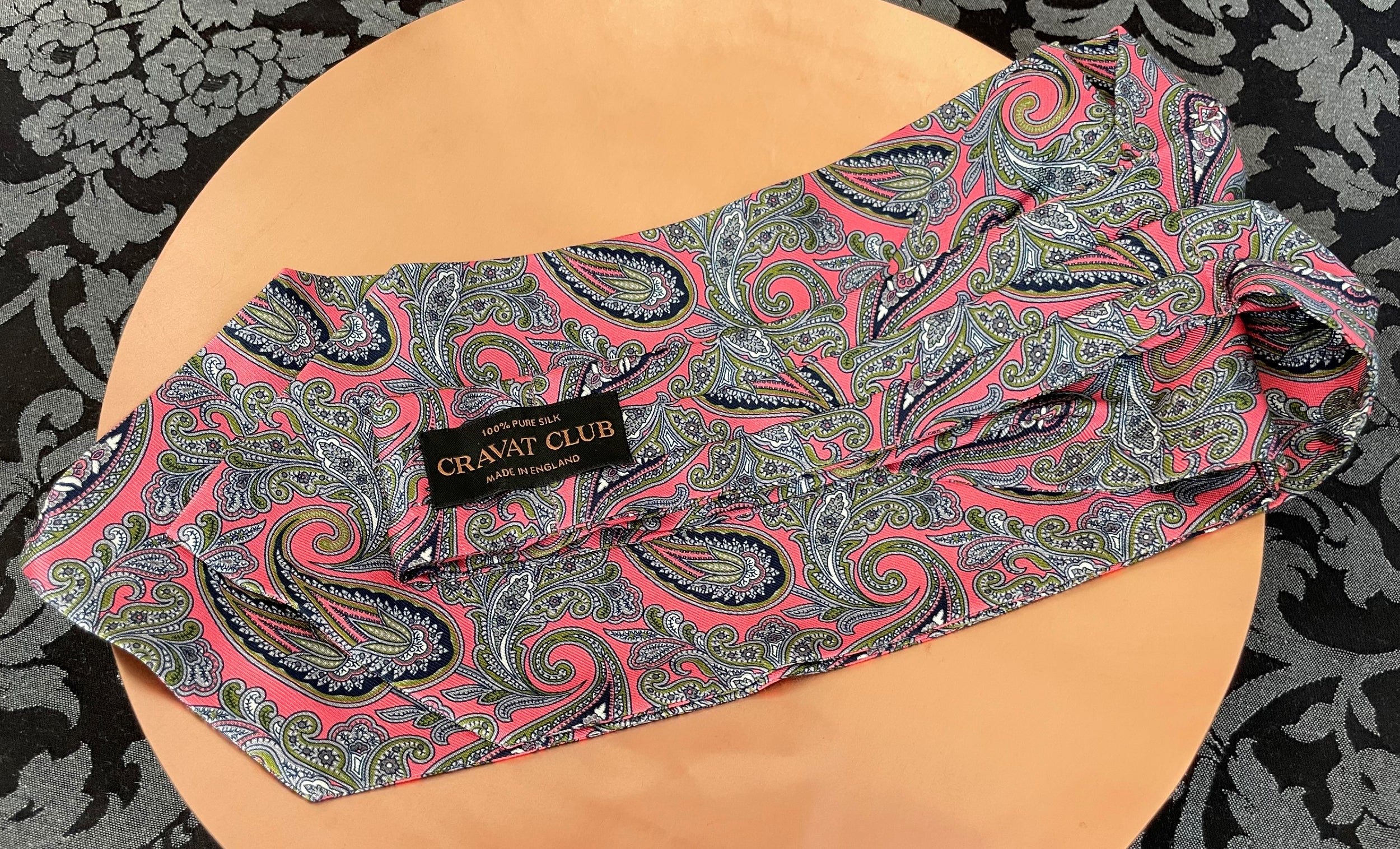 Candy Pink with Moss Green, Navy, Steel Grey & White Paisley Pattern Printed Silk Cravat