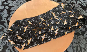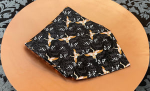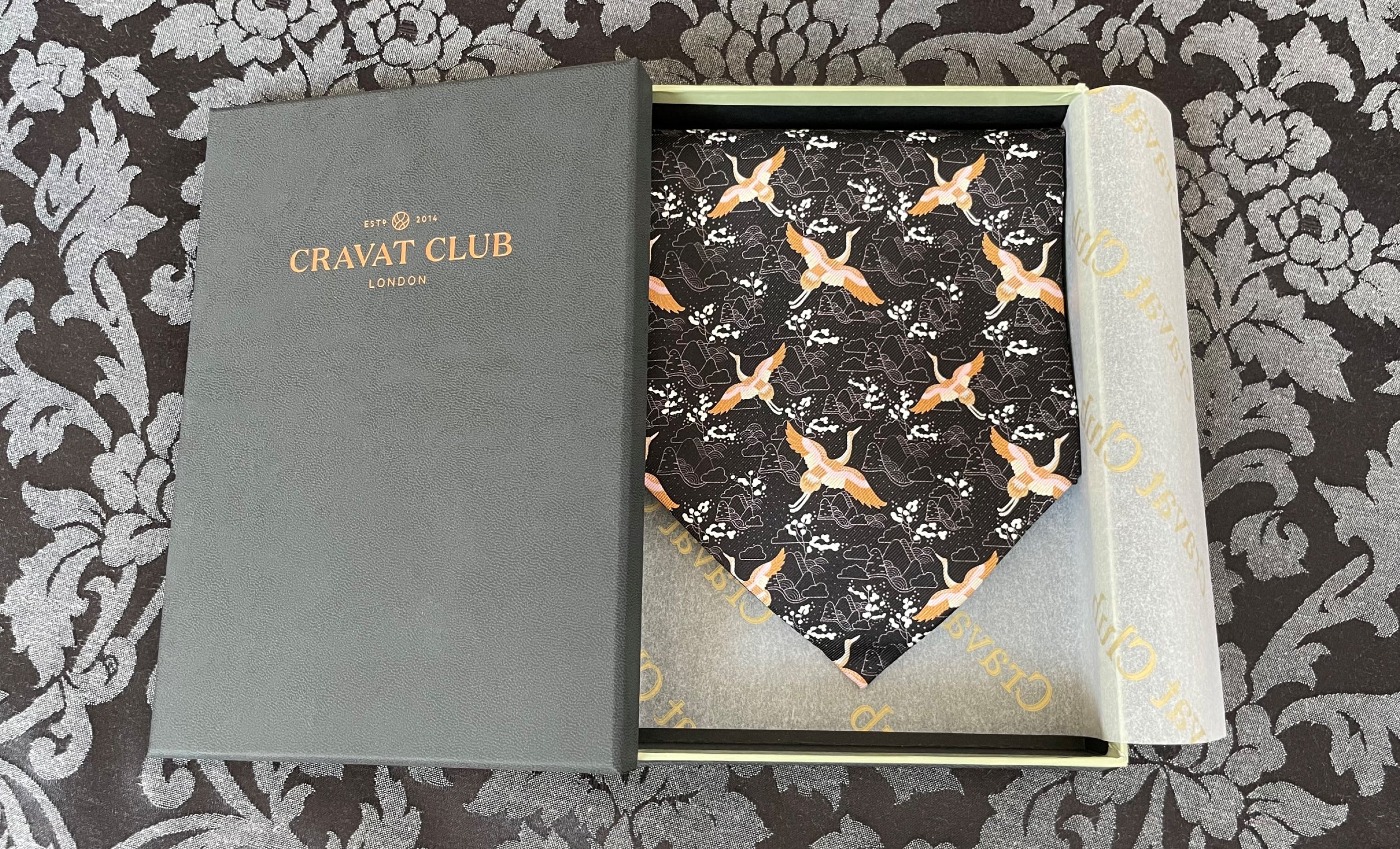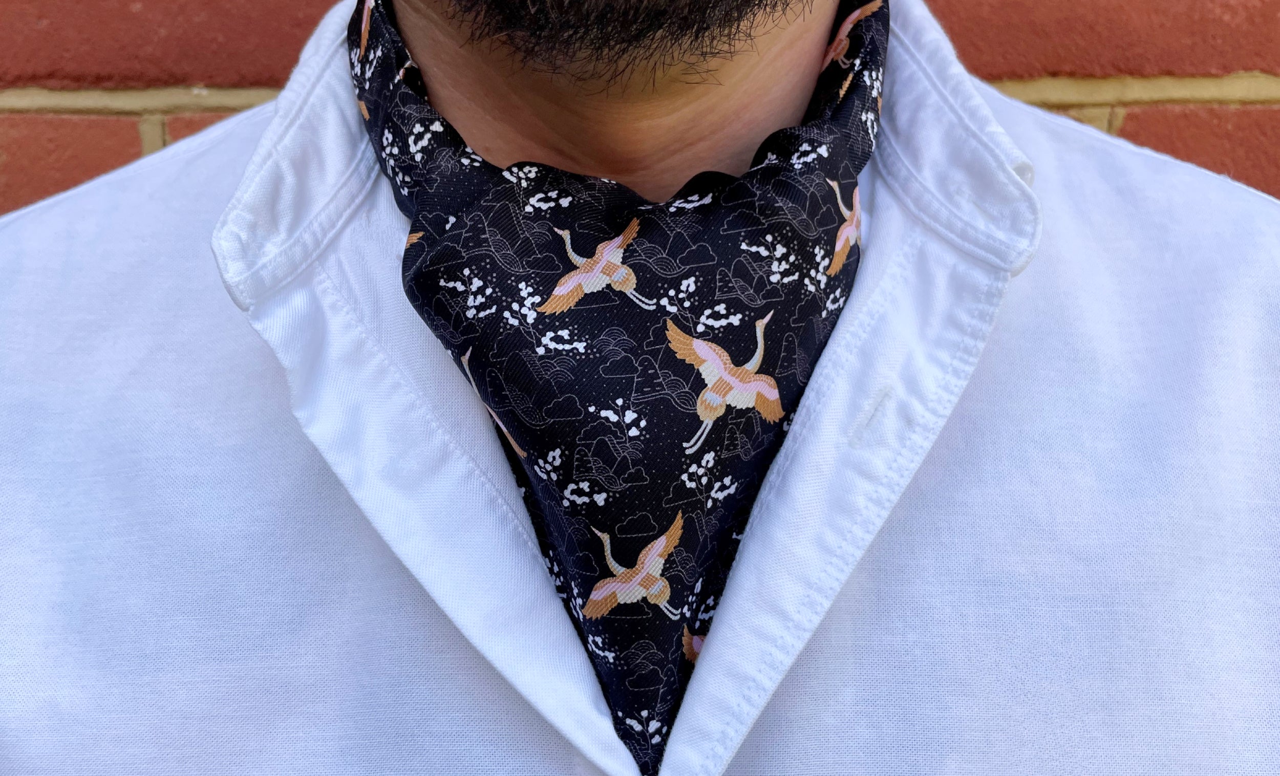 Black with Shadow Grey, Sakura Pink, Miso Brown, Gold & White Japanese Cranes & Mountains Pattern Printed Silk Cravat