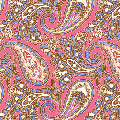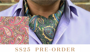 Warm Indian Pink with Cool Denim, Chocolate, Cream & White Paisley Pattern Printed Silk Cravat