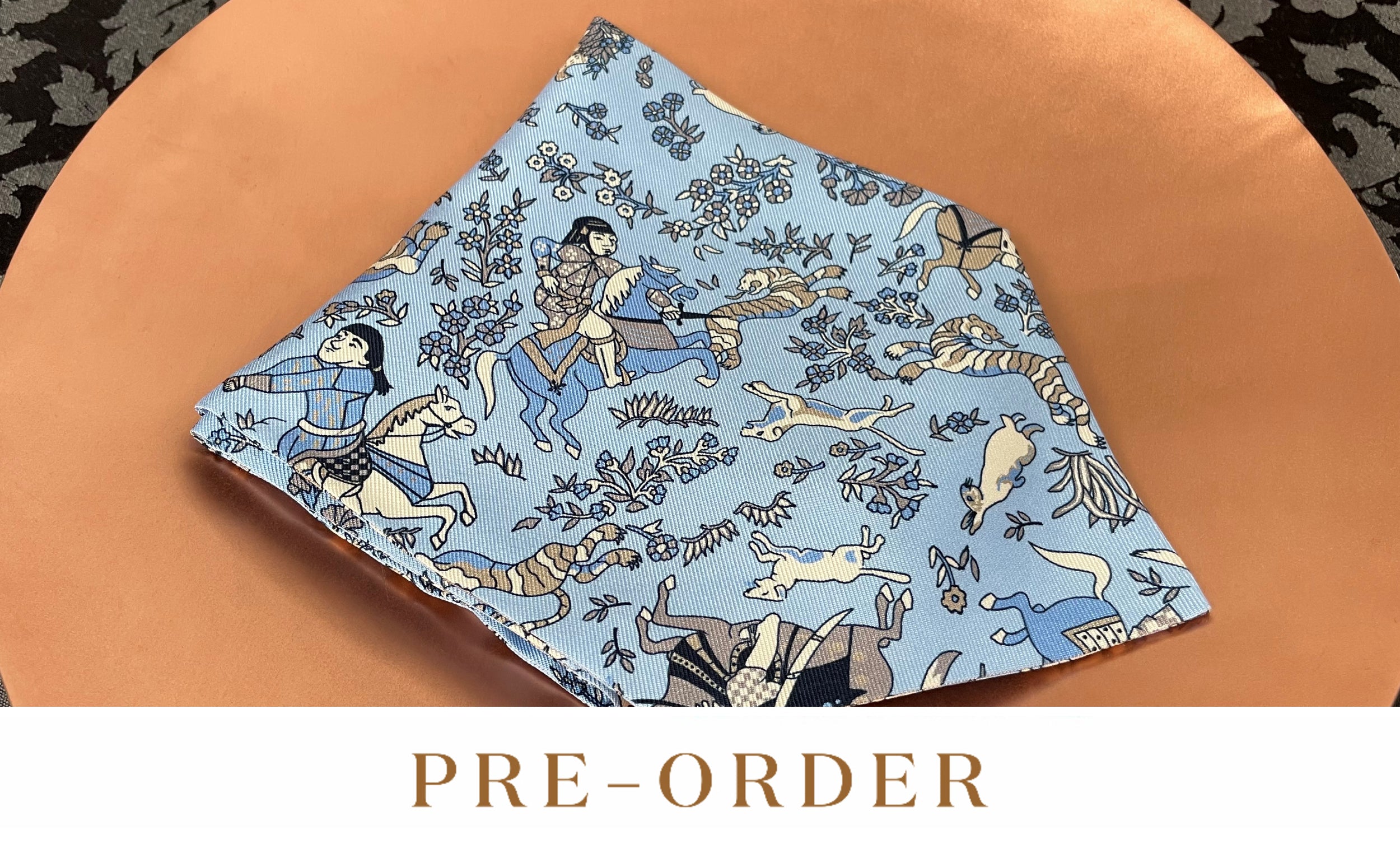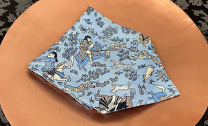 Powder Blue with Denim, Navy, White & Taupe Ancient Mongolian Hunting Scene Printed Silk Cravat