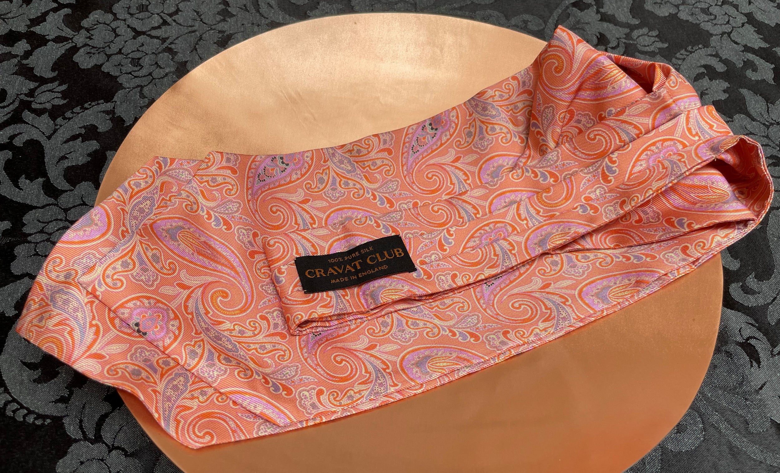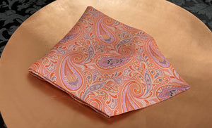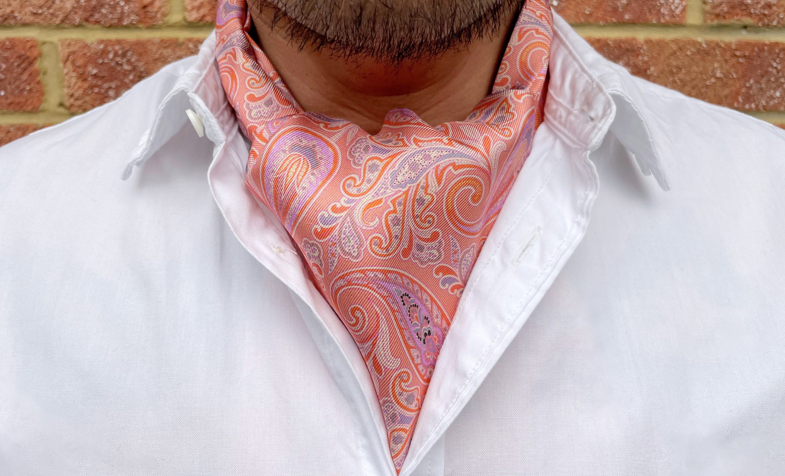 Peach Sorbet with Soft Violet, Sunset Yellow, Cloud Grey & Vanilla Cream Paisley Pattern Printed Silk Day Cravat (Ascot Tie)